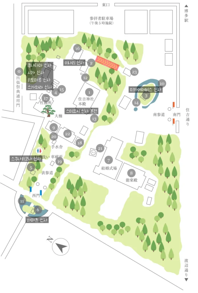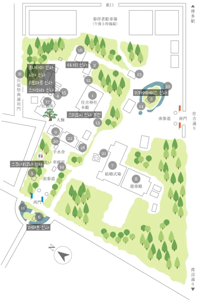 저도 이번에 찾아보면서 알게 되었는데, 스미요시 신사에는 본당(본전) 외에도 다양한 신사 건물이 있는 형태에요.