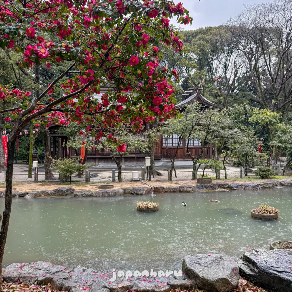청둥오리와 연못, 그리고 꽃, 배경으로 보이는 건물까지 하나의 멋진 풍경 구경을 끝으로 스미요시 신사 구경도 끝!