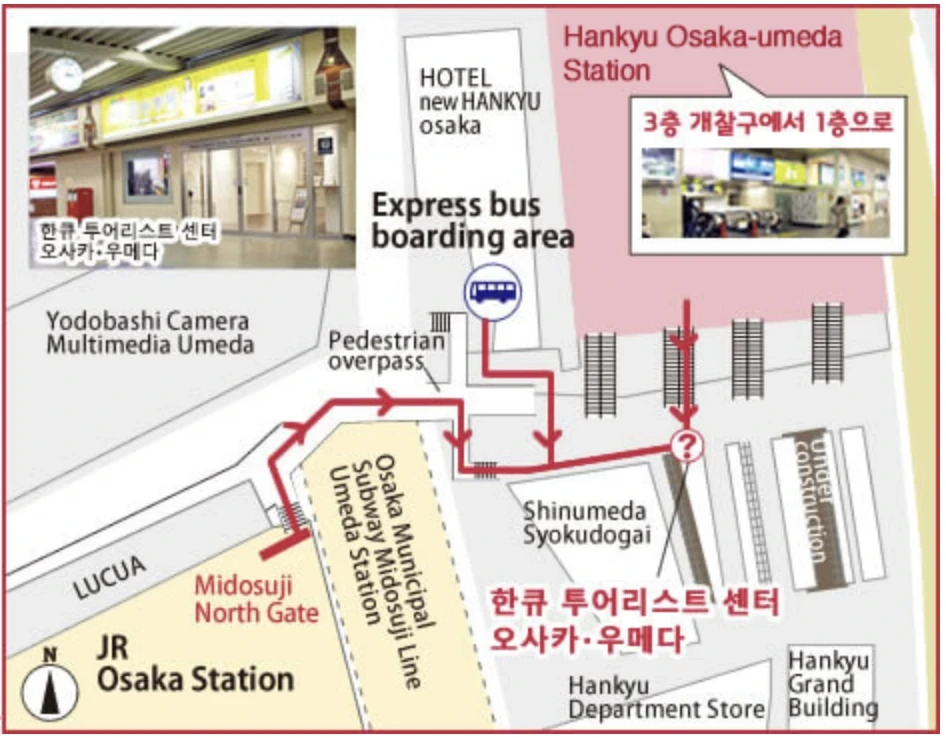 처음 방문하는 곳이라 한큐 투어리스트 센터를 찾기가 어려운 느낌이었어서 저처럼 헤매는 분들을 위해 한큐 투어리스트 센터 링크와 아래에 위치 안내 이미지를 아래에 첨부했어요.