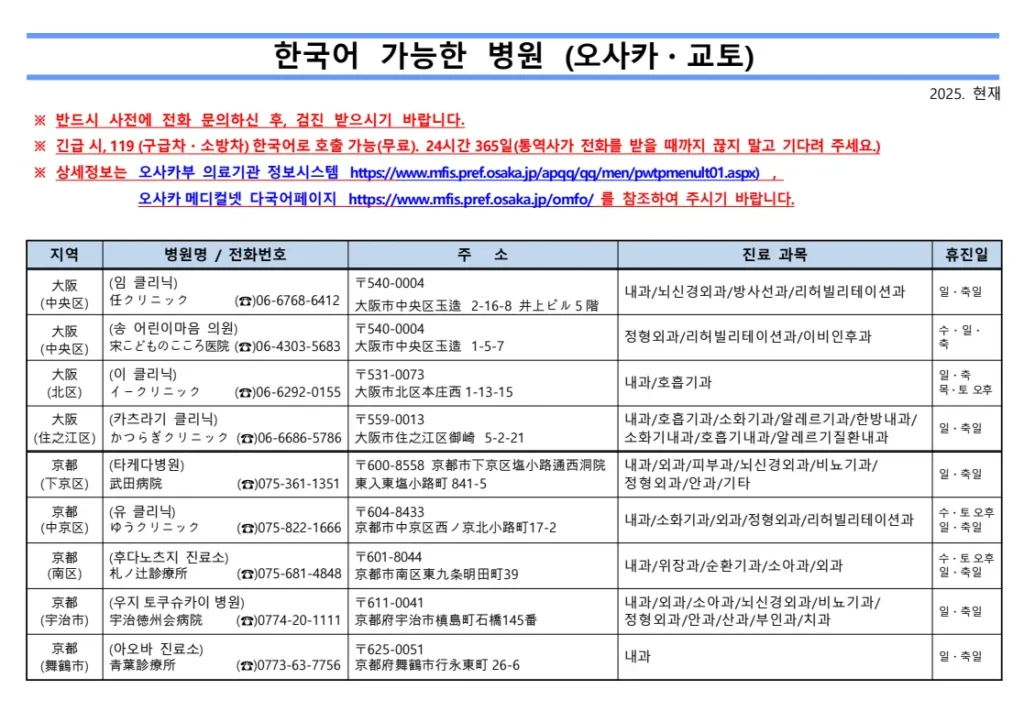 🔗 주오사카 대한민국 총영사관: 한국어 대응 가능한 병원 안내(2025년도)