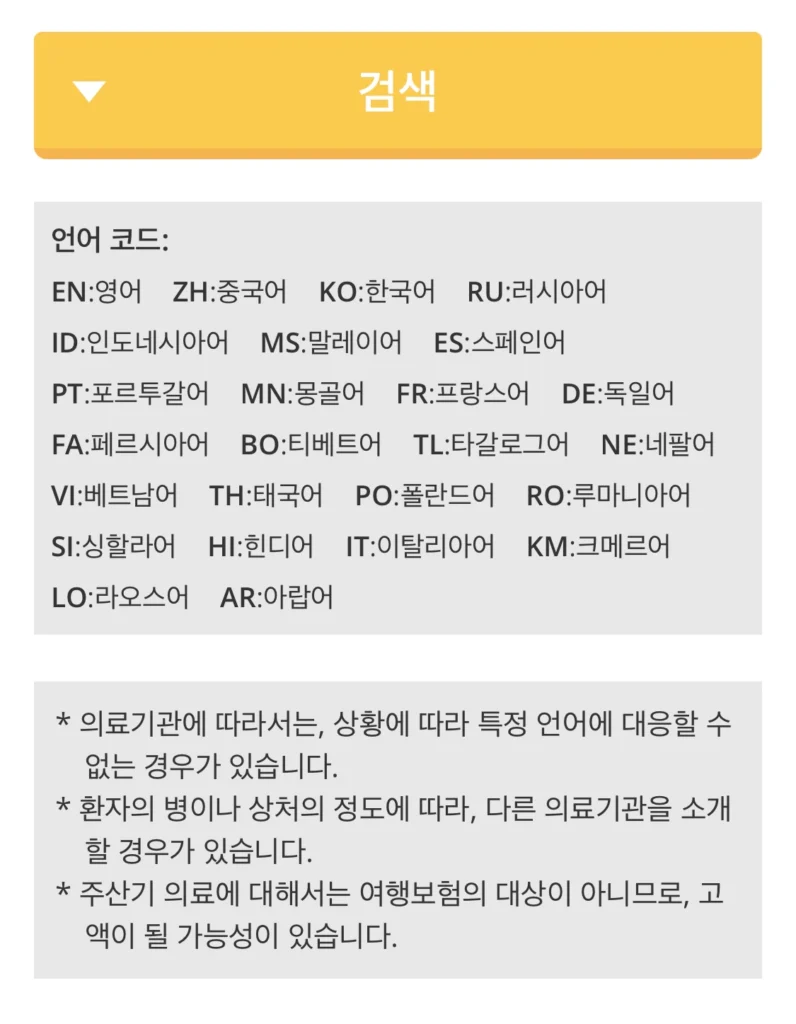 여행 중 병원에 가는 일이라면 갑작스런 일이기에 비용에 대해 대비가 되어있지 않을 수 있으니 현재 소지한 카드 브랜드(VISA/마스터 등)를 선택하여 해당 카드를 사용할 수 있는 병원을 찾는 것도 가능해요!