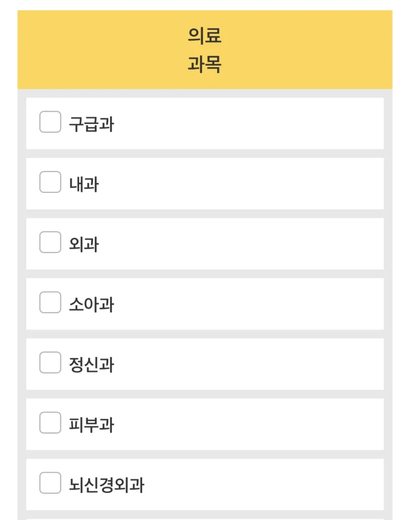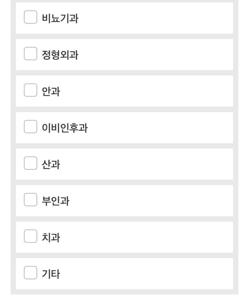 우리나라 기준으로 한국어를 선택하고, 현재 진료가 필요한 과목을 선택해요.