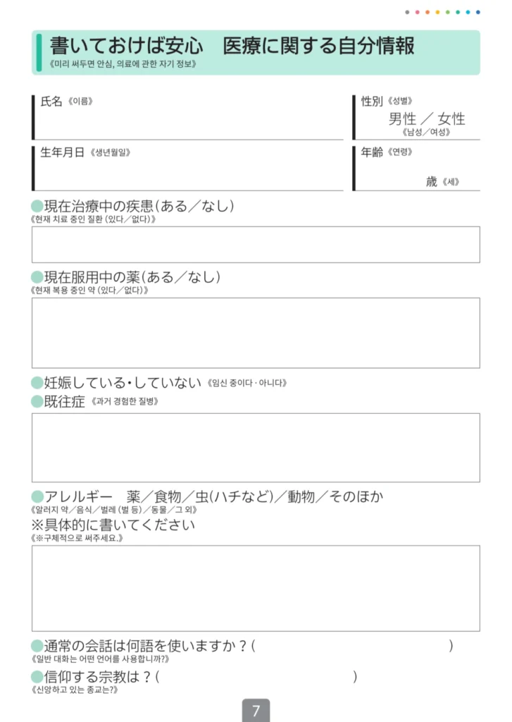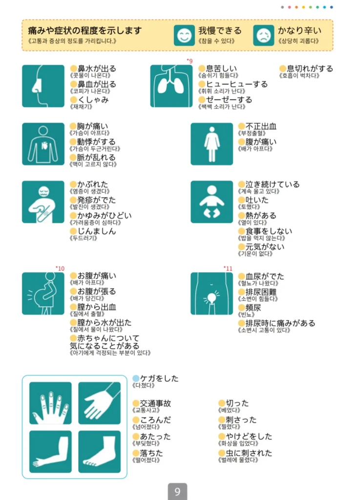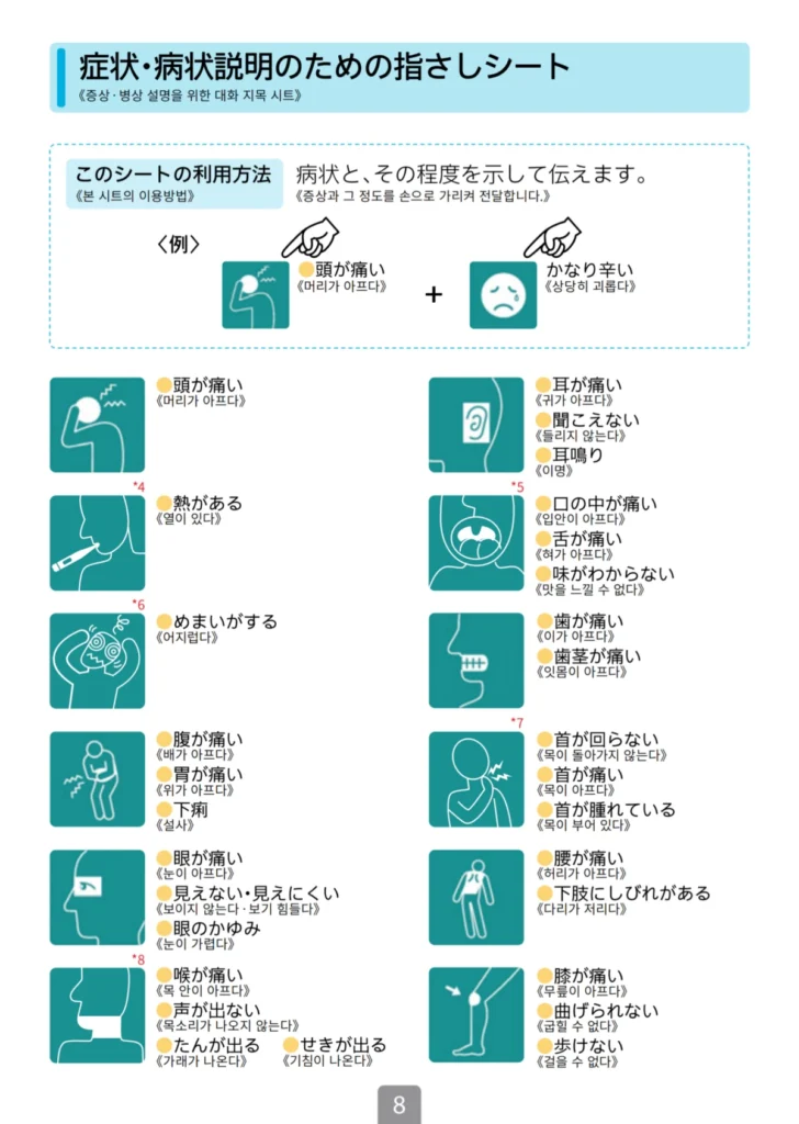 한국어가 가능한 병원을 간다고 해도, 완벽하지 않을 수 있고 그 외에도 현재 있는 지역이 한국어 가능한 병원이 없어서 주변 병원 아무 곳이나 방문해야 하는 상황이라면 본인의 증상을 설명하기 위해서 일본어를 사용할 수 있어야 하겠지만 평소에 안 쓰던 일본어가 갑자기 술술 나올리는 없기에 아픈 증상에 대해 손으로 짚으면서 설명할 수 있는 ‘대화 지목 시트’라는 것을 제공하고 있어요!