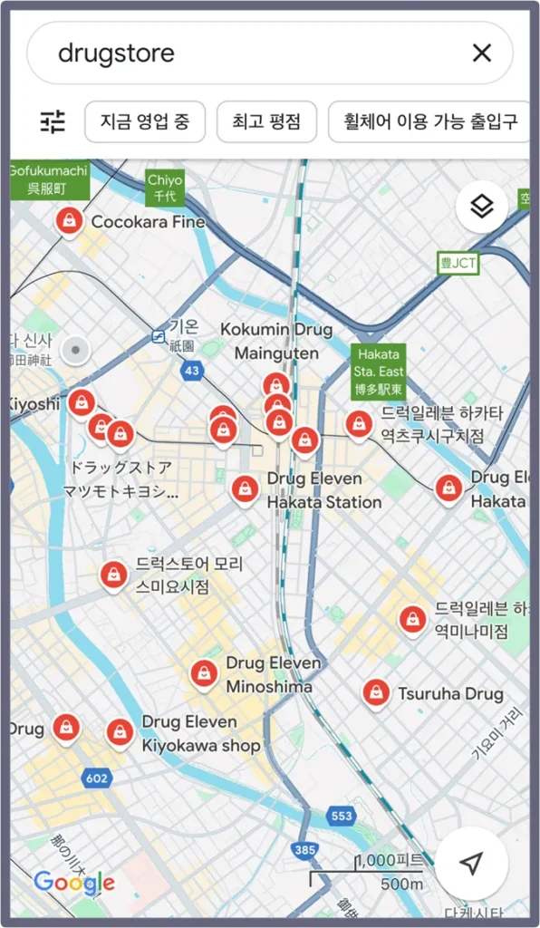 구글지도에서 원하는 지역에 지도를 두고 drugstore라고 영어로 검색하면, 대부분 도시에선 한 눈에 볼 수 있어요!