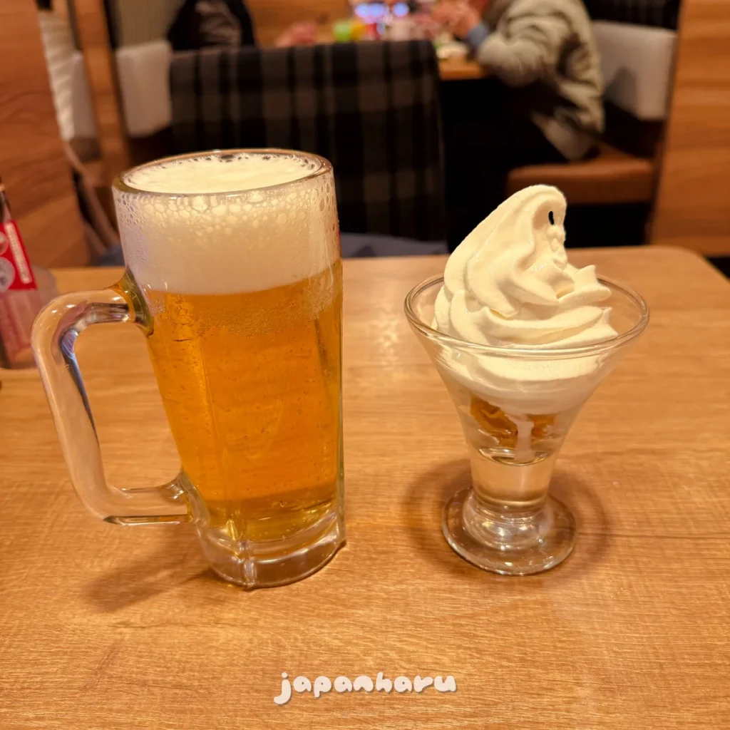아까 저녁은 먹었으니 이번에는 간단하게 소프트크림(소프트 아이스크림)과 생맥주 세트(생맥주 1잔+감자튀김)로 주문했어요.