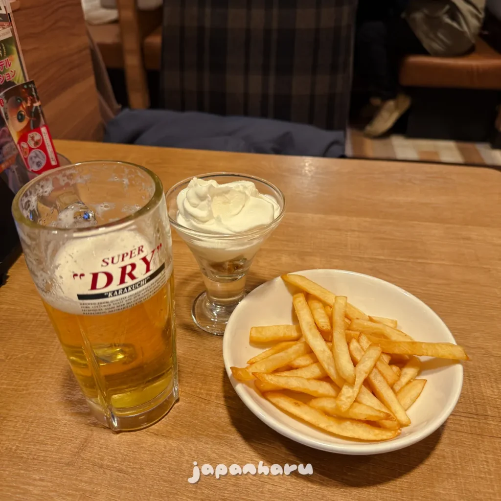 - 생맥주 세트(생맥주 1잔+감자튀김): 600엔