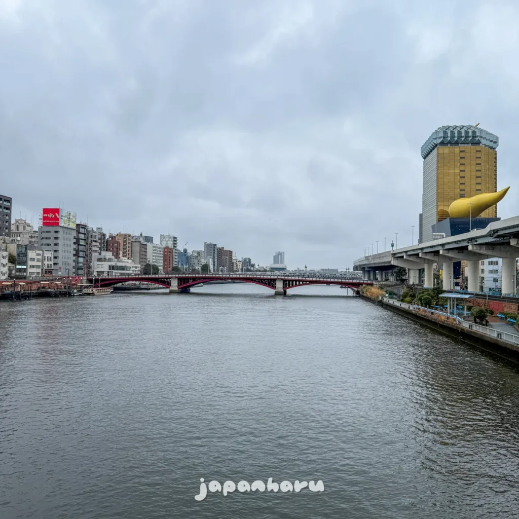 저 다리 왼쪽으로는 아사쿠사역과 센소지, 오른쪽으로는 맥주빌딩이에요.