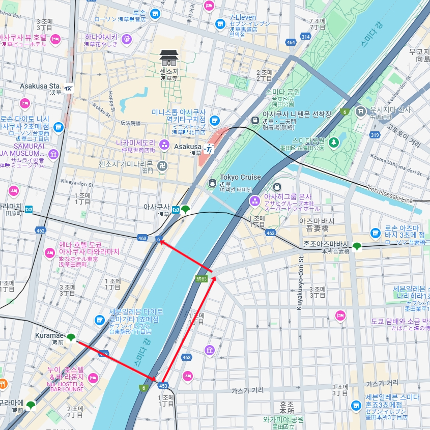 아즈마바시는 붉은색, 고마가타바시는 파란색, 우마야바시는 초록색으로 보면 이 3개의 다리는 얼추 구분할 수 있어요 ☺️