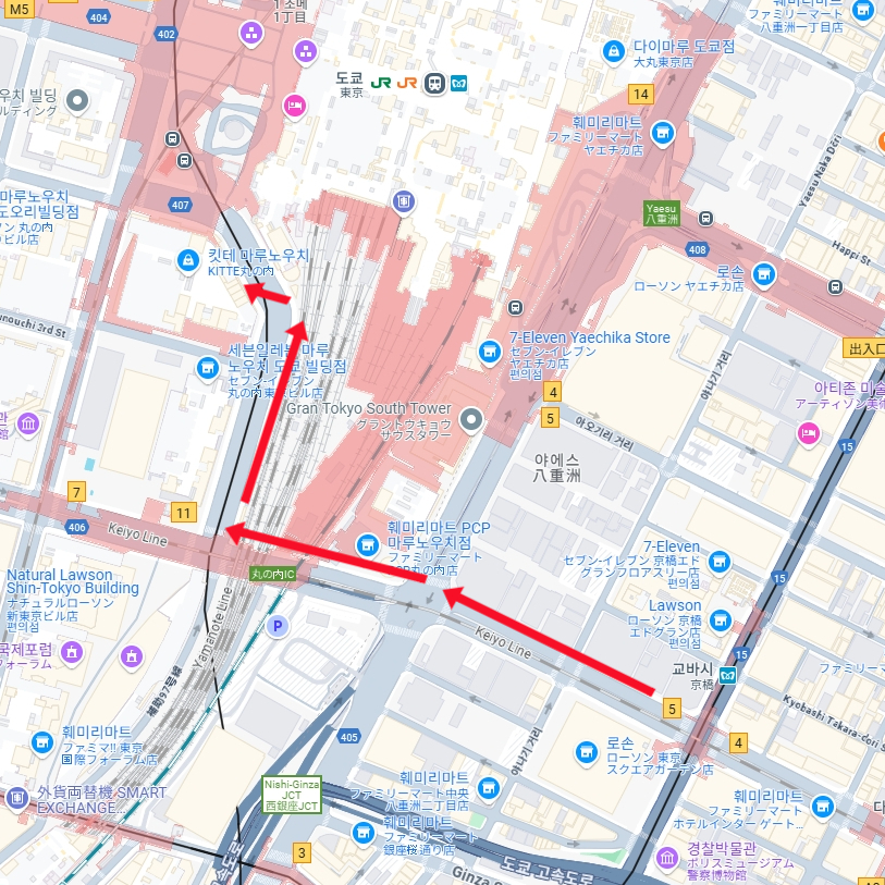 이렇게 걸어서 킷테 마루노우치까지 갈 예정이에요.