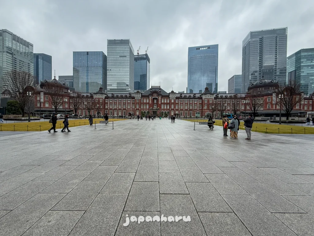 도쿄역 앞에는 광장이 있는데, 이렇게 대칭을 하고 있는 레트로함이 느껴지는 도쿄역과 그 앞의 광장, 그리고 뒤편으로 보이는 높은 빌딩들이 어우러지는 풍경을 볼 수 있어요.