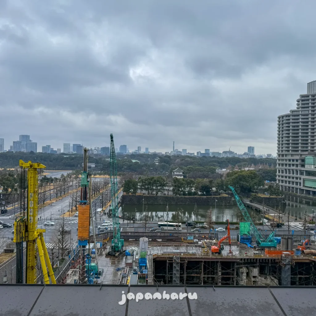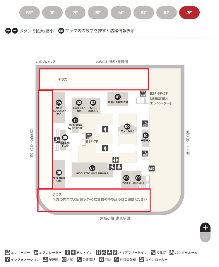 테라스가 삼면으로 되어 있기 때문에 모든 방향에서 보이는건 아니지만, 위의 평면도 기준 아래쪽 방향에서는 도쿄역과 그 앞 마루노우치 광장이 보여요 ☺️