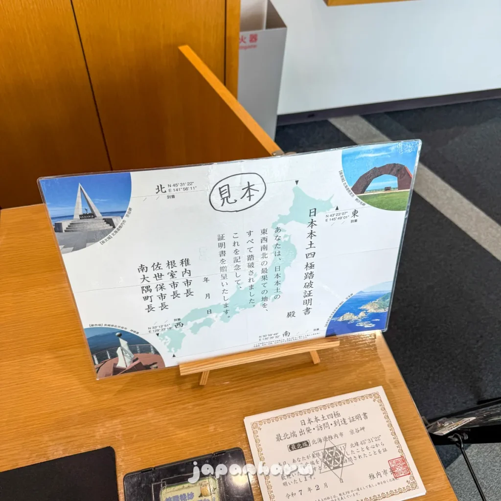 본토 극점 4곳에서는 ‘일본본토사극 출발·방문·도달 증명서(이하 ‘일본본토사극증명서’)’를 기념품으로서 무료로 발급해주고 있어요!