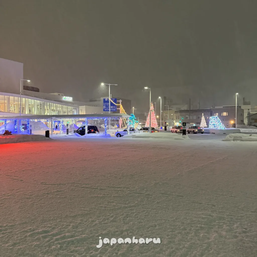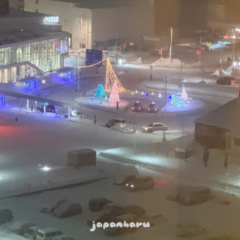 호텔에서 잠시 쉬다가 피곤해서 저녁을 먹을까 말까 고민하다가 잠시 복도에 나와서 왓카나이역 쪽을 봤는데, 역 앞 광장에 보이는 일루미네이션이 눈에 띄어요.
