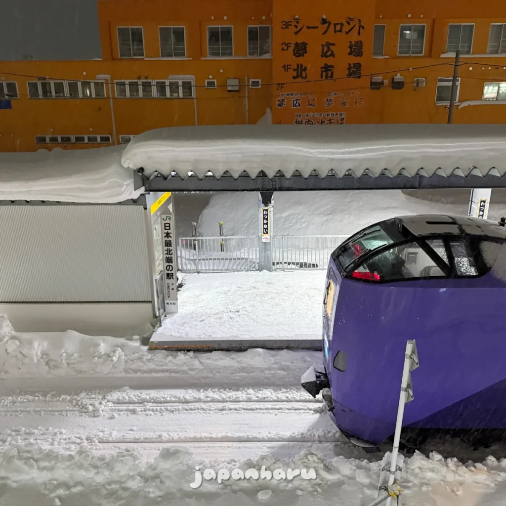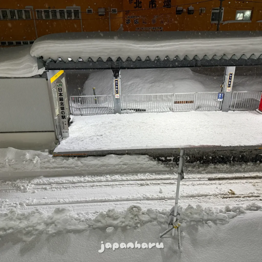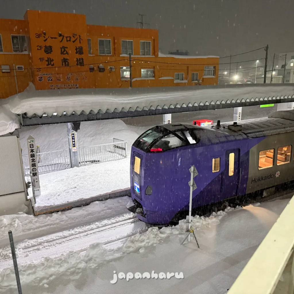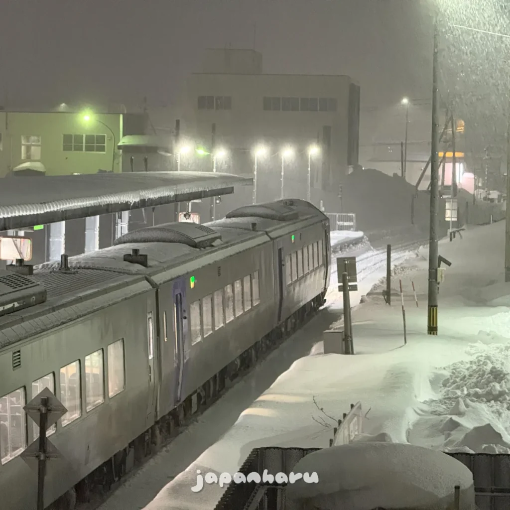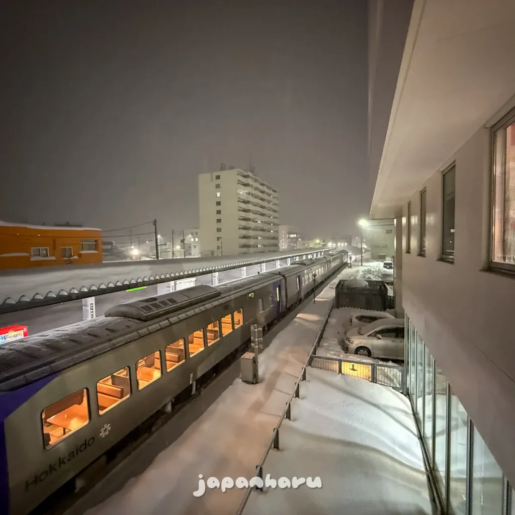 하필 저녁시간에 가까워지니 꽤나 거센 눈발이 날리고 있어서 나가기 귀찮아하다가 ‘그래도 저녁은 먹고 오자’는 생각으로 밖으로 향하면서 중간에 왓카나이역에서 삿포로행 열차가 출발하는걸 보고 가자는 생각으로 역으로 향해봤어요 ☺️