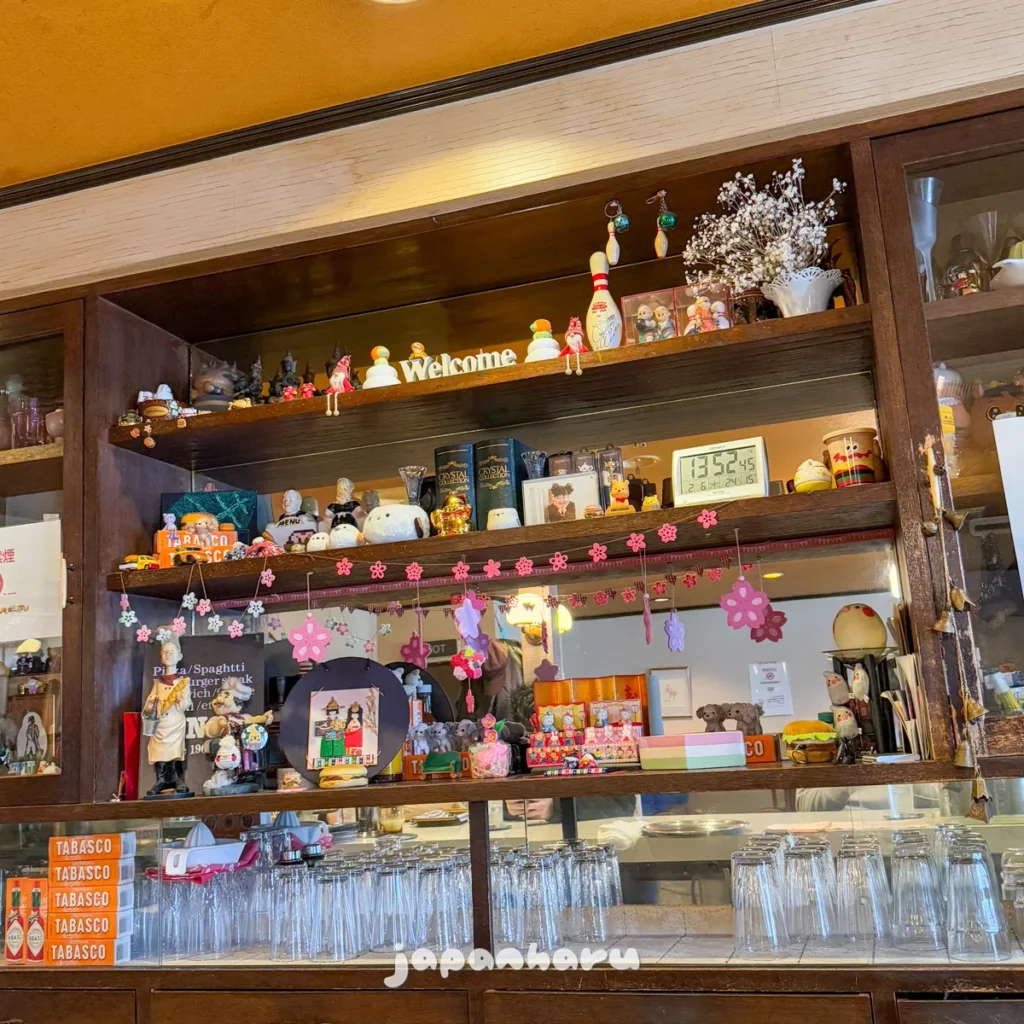 장식장에 놓인 이런저런 물품들과 아래에 가지런히 놓여있는 유리잔을 보며 잠시 기다려요.