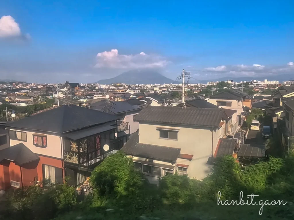열차가 출발하고, 저 멀리 구름에 가려지긴 했지만 화산섬 사쿠라지마가 보여요.