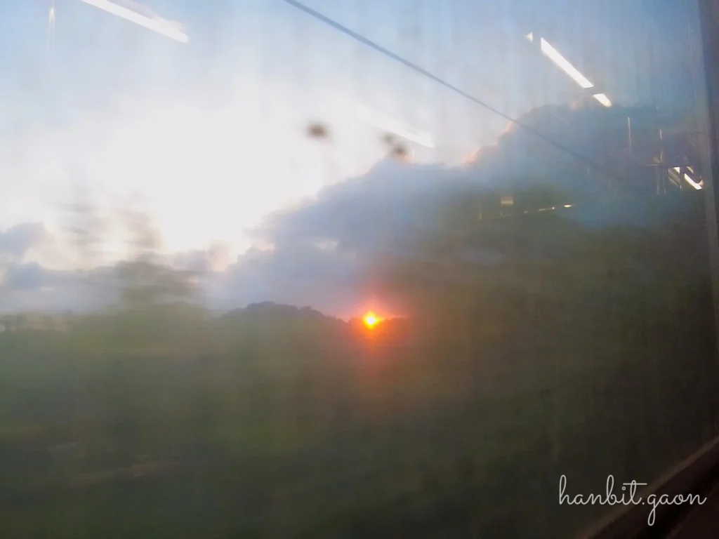 열차를 타고 창 밖을 보니 해가 지고 있네요.