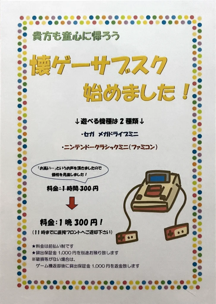 - 레트로 게임기(패미컴, 세가 메가드라이브) 대여 가능(1일 300엔)