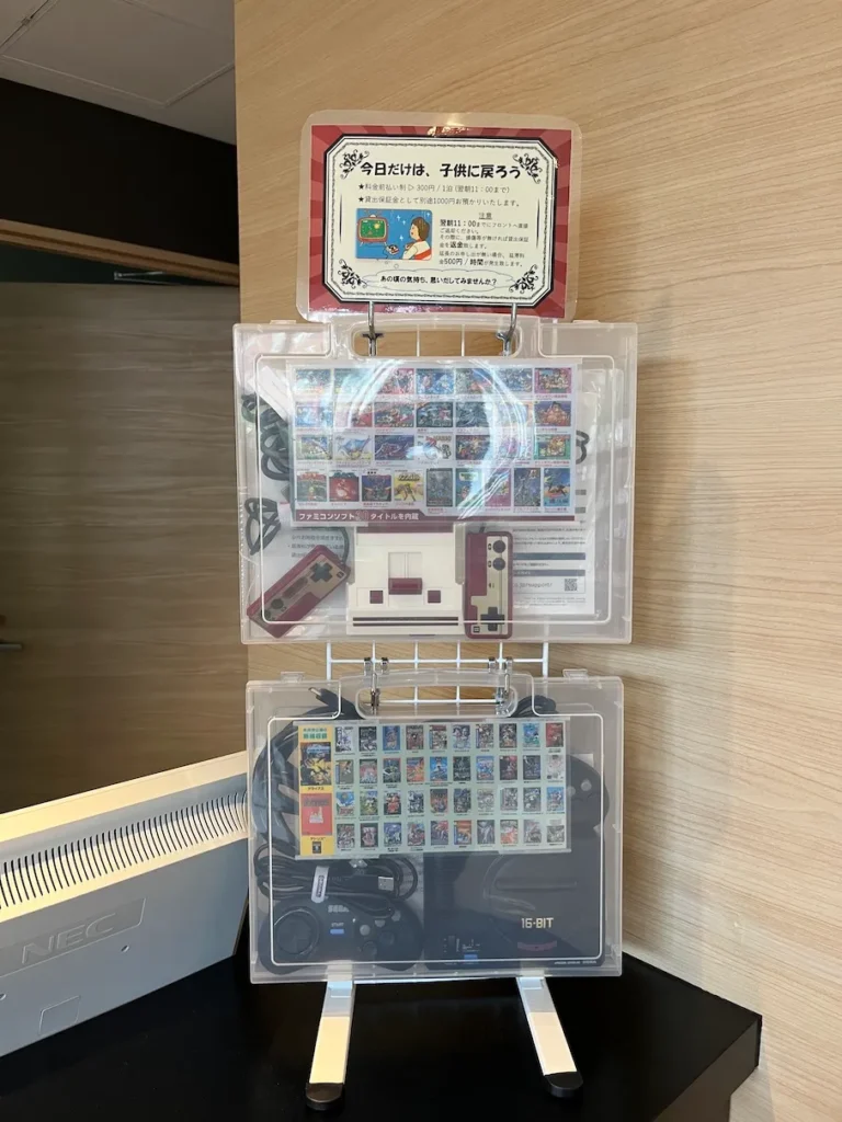 그 외 특징으로는 레트로 게임기인 패미컴 또는 세가 메가드라이브를 1일 300엔에 대여할 수 있다고 되어 있었어요.
