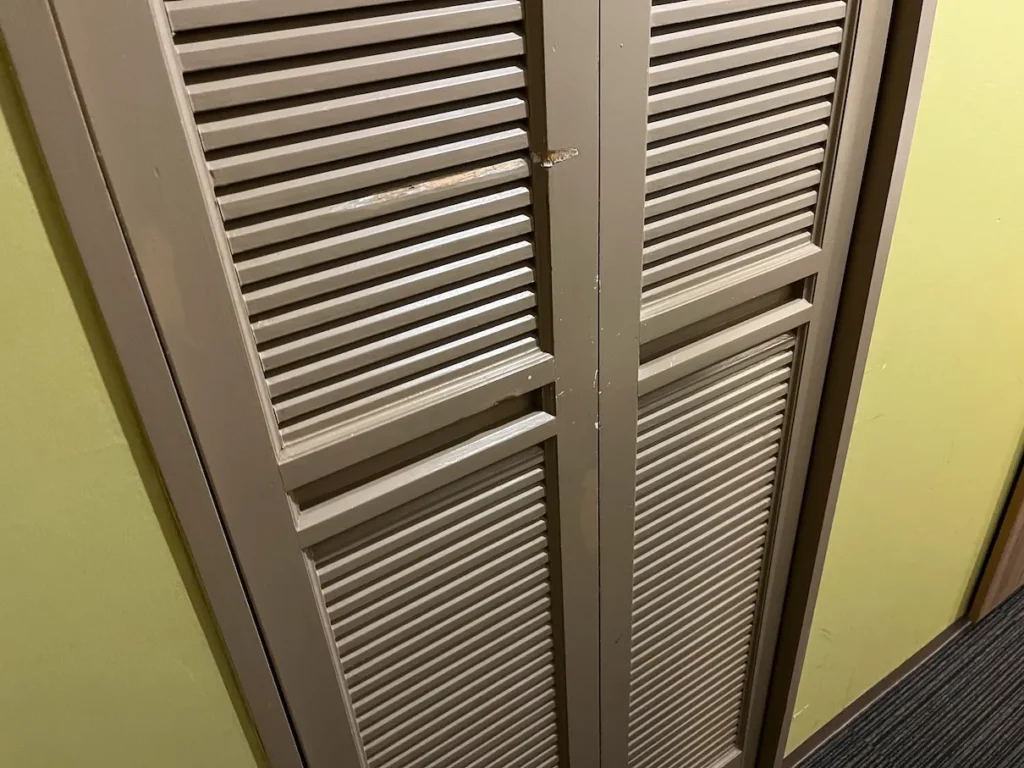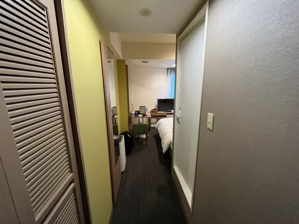 객실 입구 쪽에는 옷장이 있는데, 여닫이식이에요.