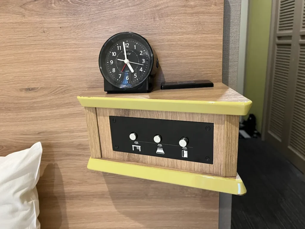 침대 머리맡 쪽에 조명 스위치와 작은 시계가 있어요.