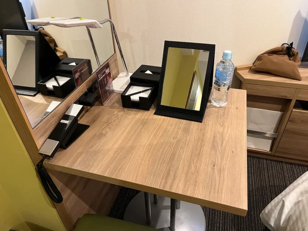 탁자에는 거울과 휴지, 전화, 생수 1병이 있어요.