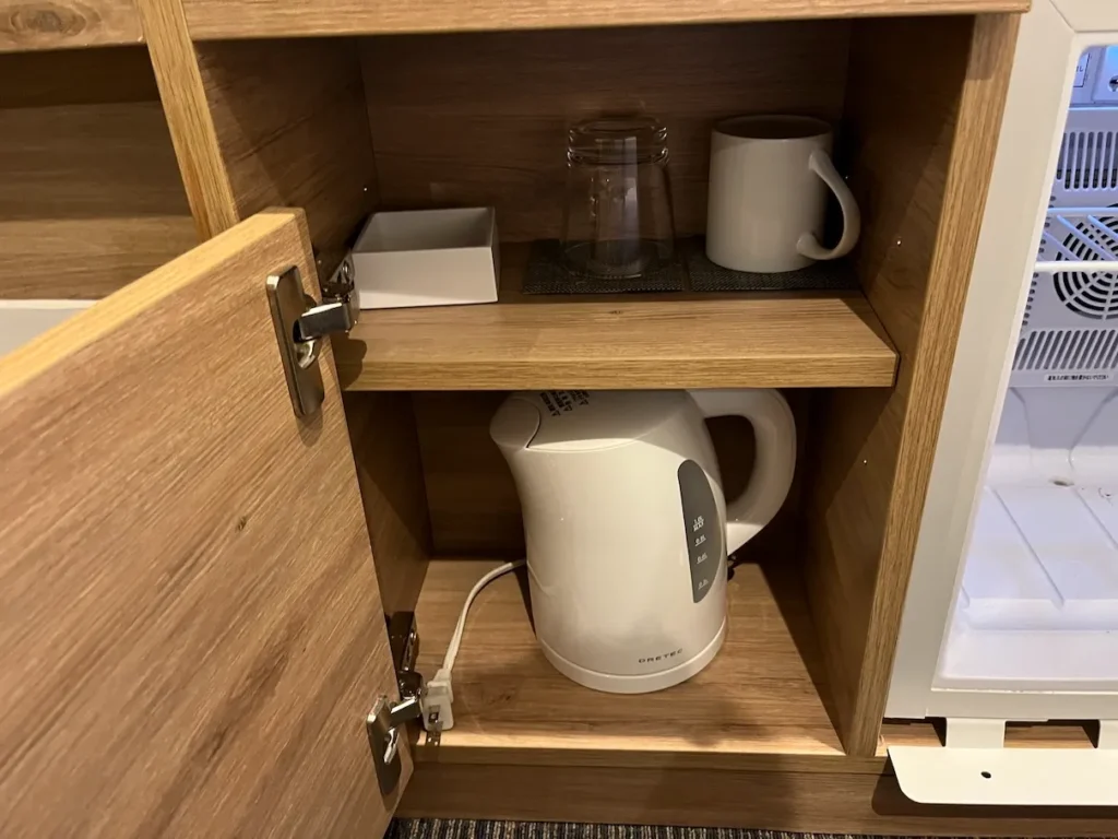 냉장고 전원 스위치 아래의 문을 열어보면 유리잔 1개, 머그컵 1개, 전기포트(커피포트)가 있어요.