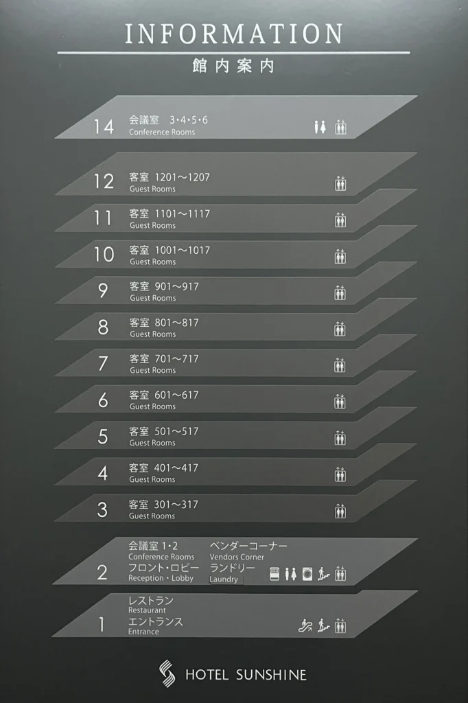 1층은 레스토랑, 2층은 프론트데스크와 코인세탁기, 자판기 등이 있고 3층부터 12층까지는 객실이에요.