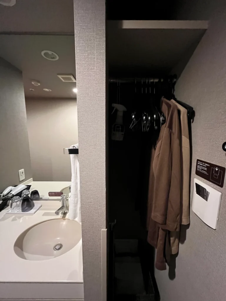 객실 문을 열면 세면대 오른쪽에 오픈형 행거가 있고, 옷장 아래에는 수건이 있고 옷장에는 하의와 상의로 분리된 가운이 있어요.