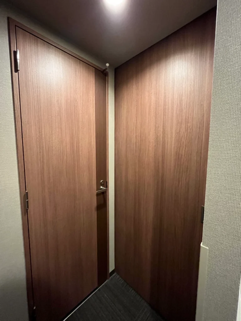객실 문을 열고 세면대를 지나면 문이 2개 보이는데 왼쪽의 문은 화장실 문이고 오른쪽 미닫이 문은 객실 문이에요.
