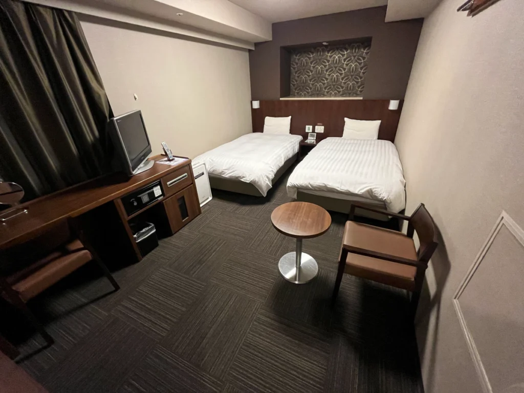 객실은 침대가 한쪽에 있고 테이블과 의자 2개, 그리고 TV가 올려져 있는 책상이 있는 형태에요.