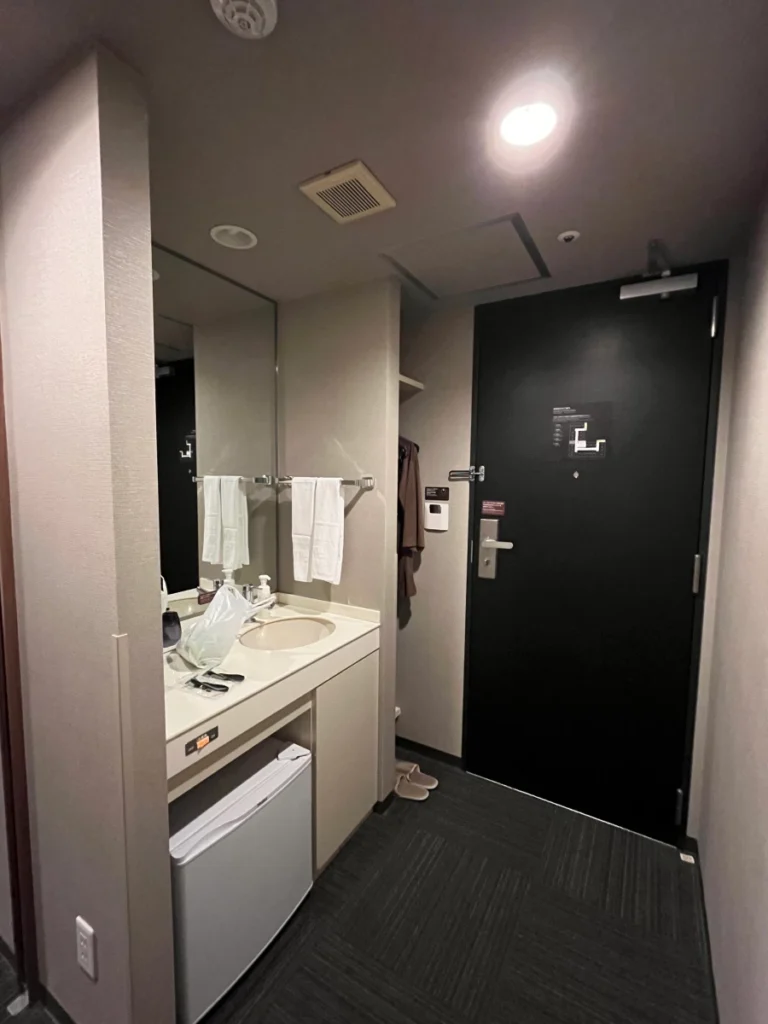 객실 문을 열고 들어가니 바로 세면대와 세면대 아래에 작은 냉장고가 있어요.