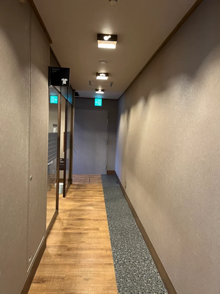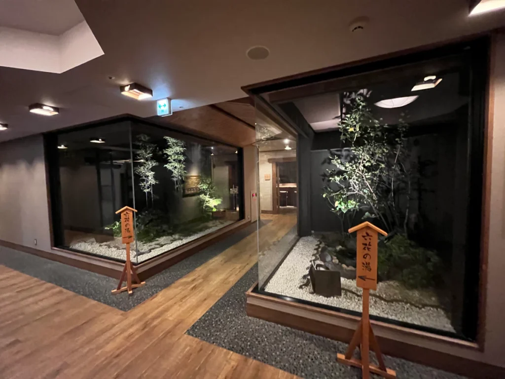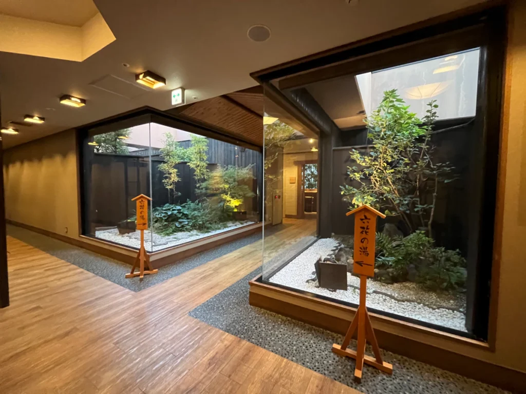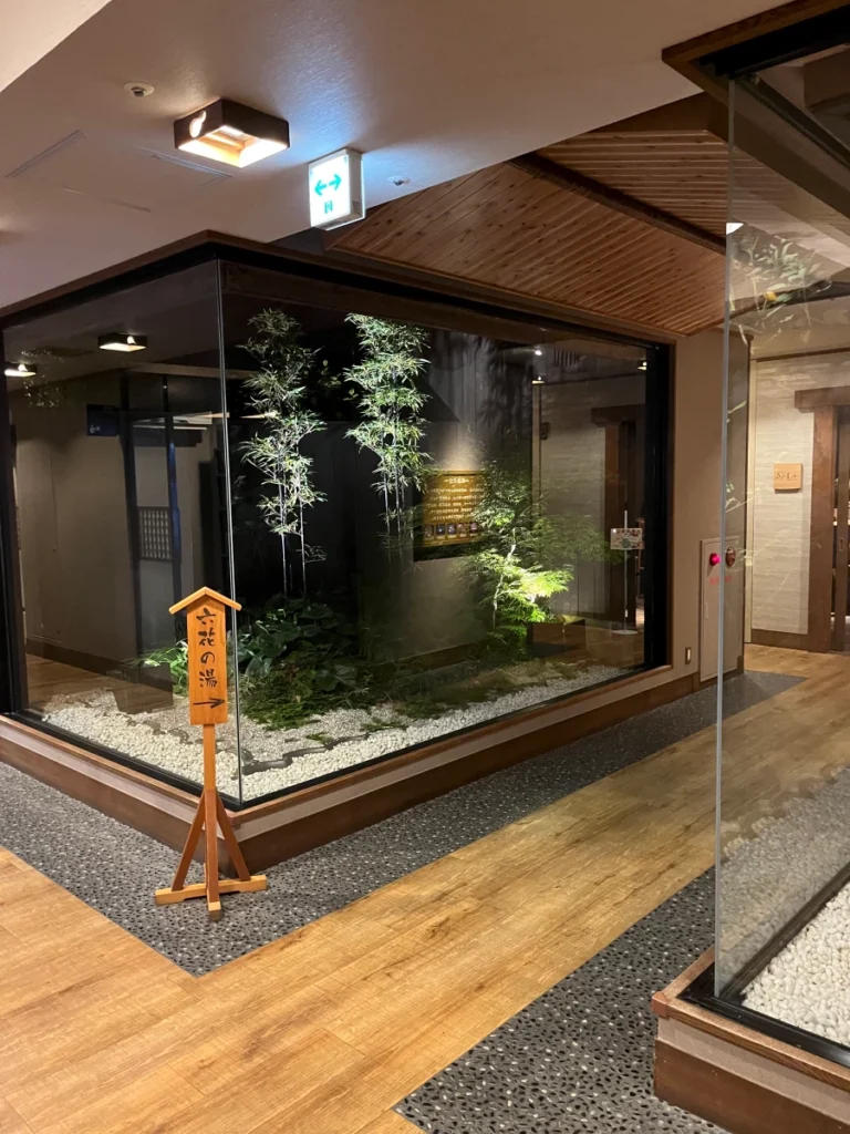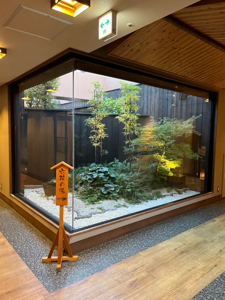 엘리베이터를 타고 13층에 내리면 대욕장으로 가기 전 간단한 정원이 보이는데 천장이 뚫린 구조라 낮과 밤의 모습이 다른게 인상적이에요.