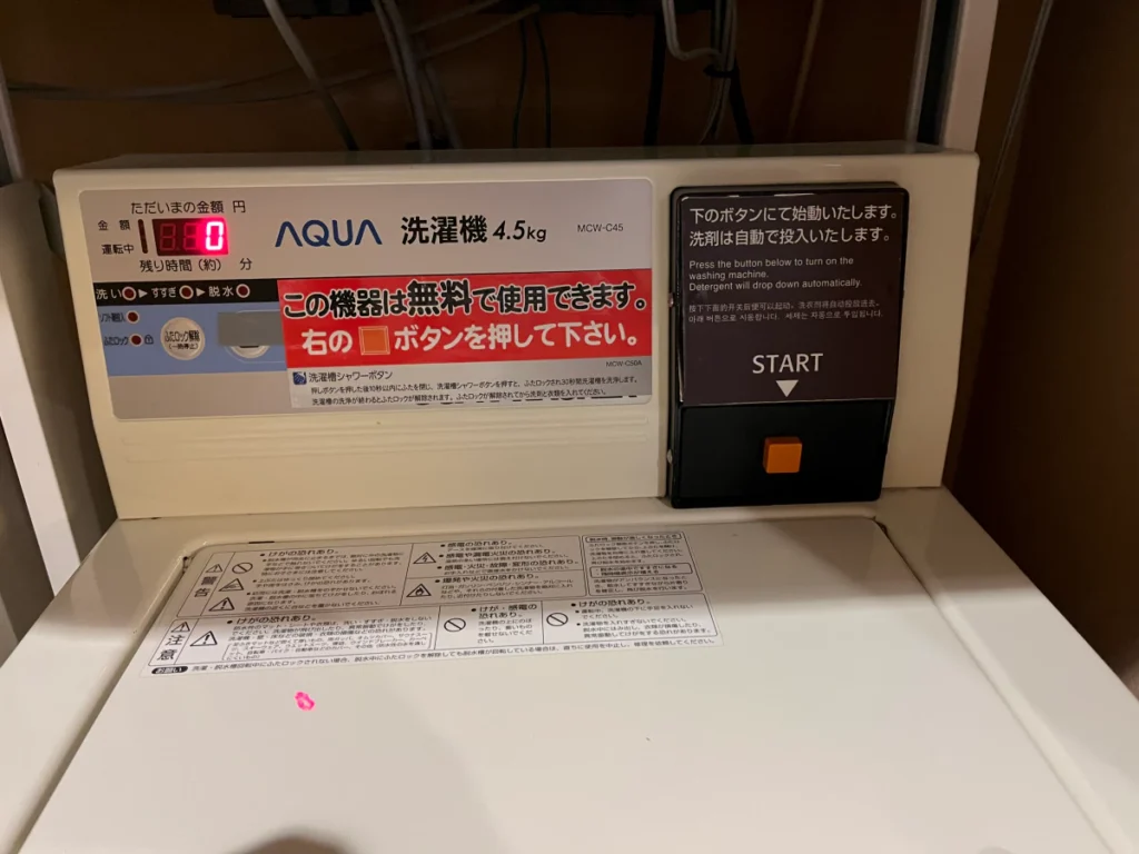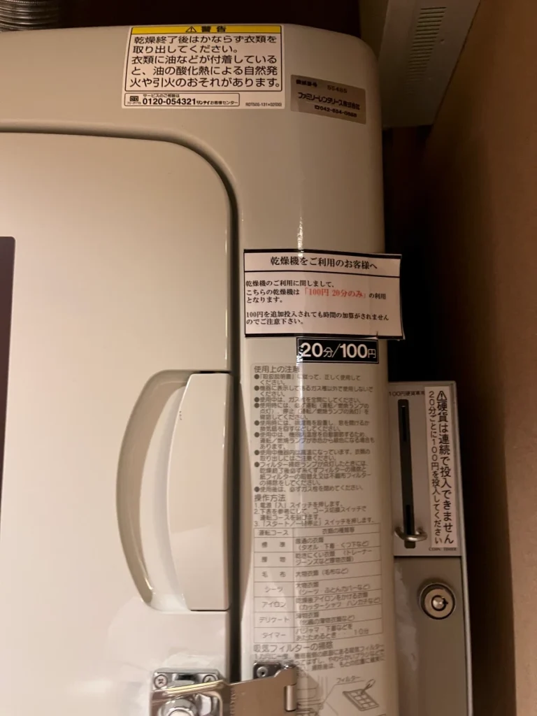 위와 같이 건조기는 20분에 100엔, 세탁기는 무료에 세탁기는 세제가 자동으로 투입되는 방식이에요.