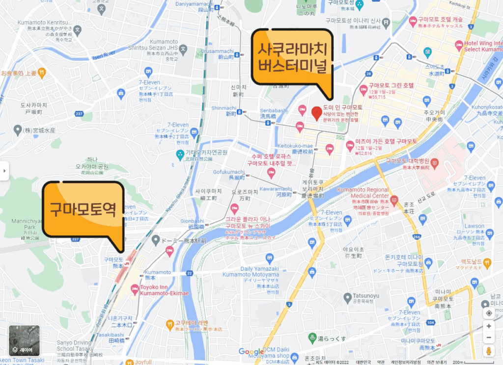 구마모토역에서는 노면전차와 걷는 것을 합쳐서 10분에서 15분 정도 정도 걸리고 사쿠라마치 버스터미널에서는 나와서 도보로 1분 정도 걸려요.