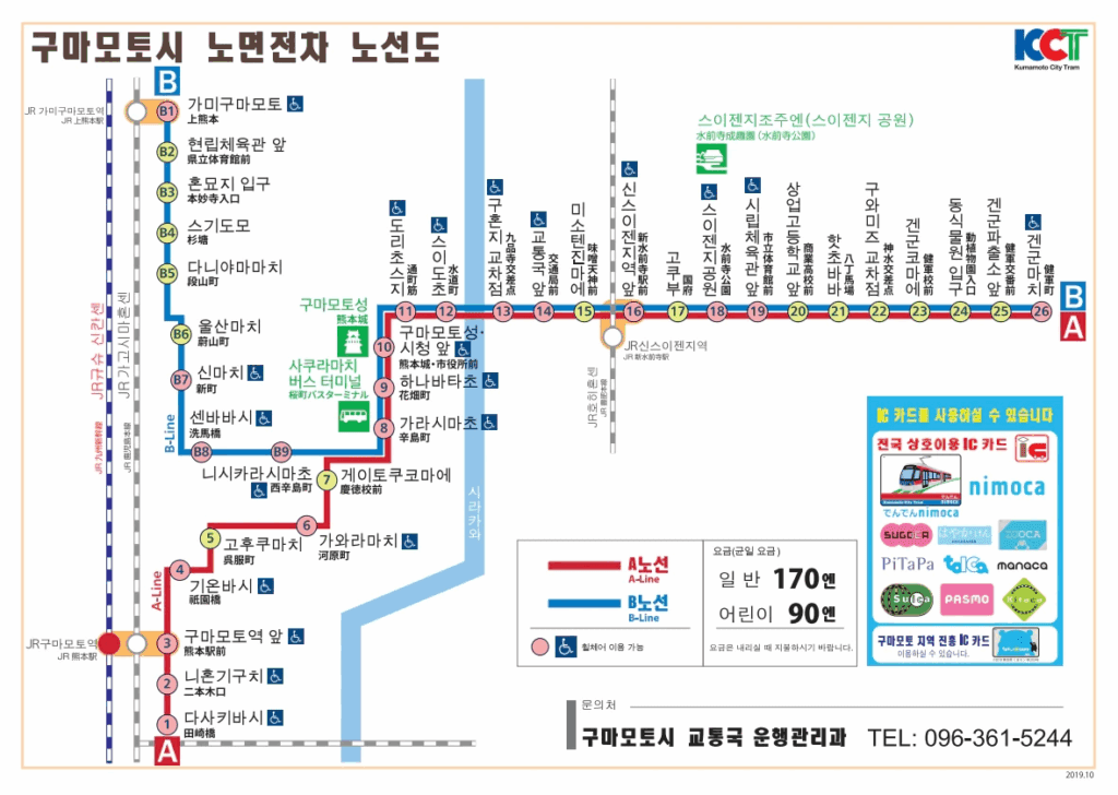 구마모토에서 여행할 때는 노면전차를 주로 이용하는데, 2개 노선이 있고 빨간색 노선이 A노선, 파란색 노선이 B노선이에요.