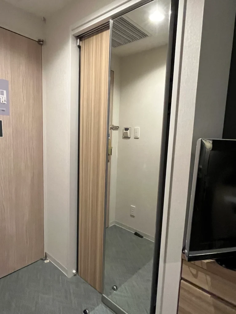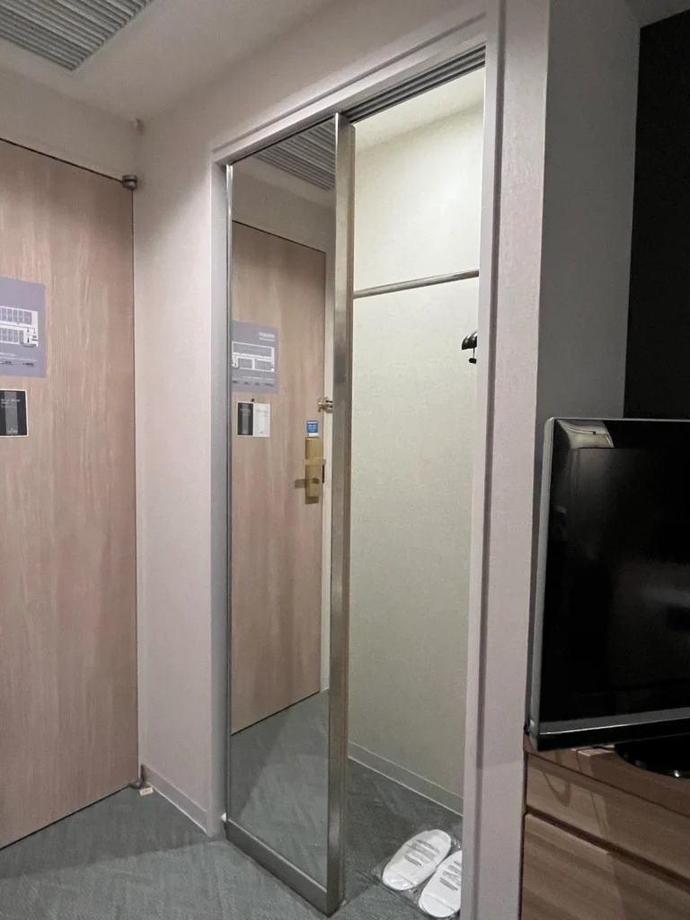문 앞에 옷장이 있는데 전신거울이 붙어있는 형태에요.