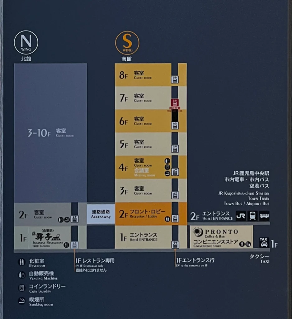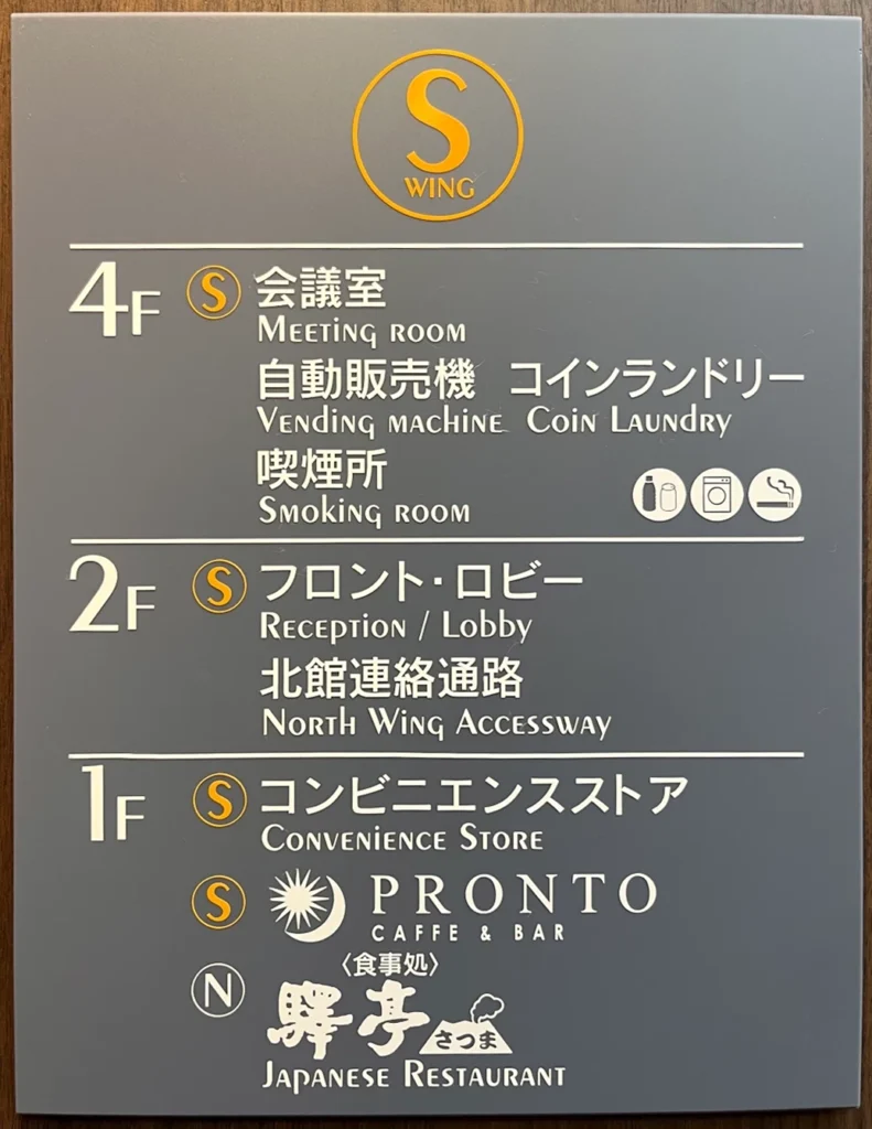 제가 묵은 남관 기준으로, 1층에 카페&바, 레스토랑, 편의점이 있고, 2층에 프론트데스크, 4층에 흡연실과 자판기, 제빙기, 전자레인지, 셀프세탁기&건조기가 있어요,