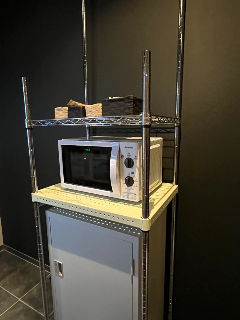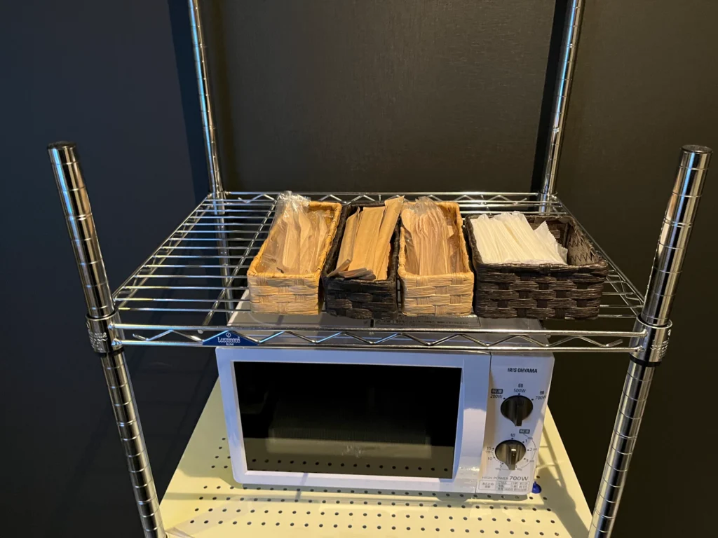 뒤편으로는 전자레인지가 있고 전자레인지 위쪽에 나무젓가락, 포크, 물티슈, 냅킨이 비치되어 있어요.