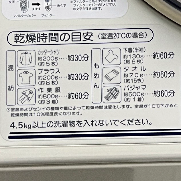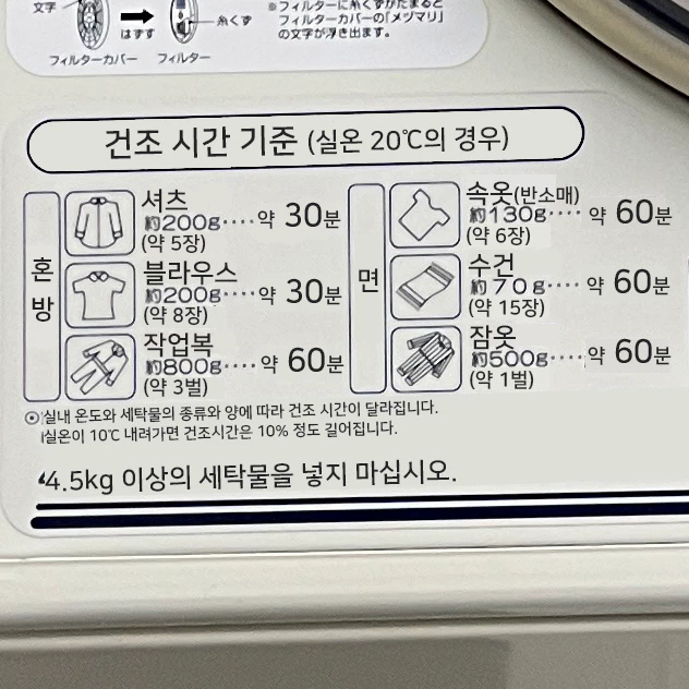건조시간 안내인데, 왼쪽이 원본이고 오른쪽은 제가 한글로 번역해 둔 것이에요.