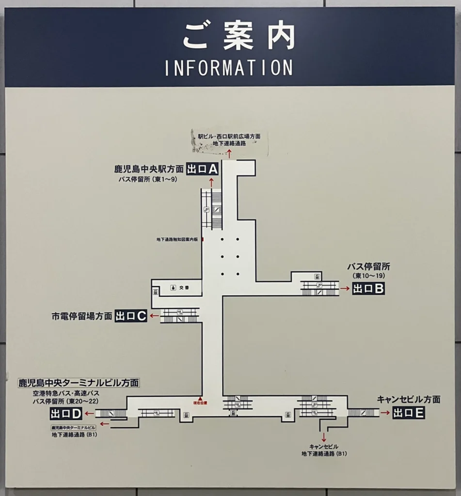 가고시마추오역 쪽은 A 출구, 호텔은 D 출구 쪽이고, C 출구는 노면전차를 타는 쪽 출구에요.