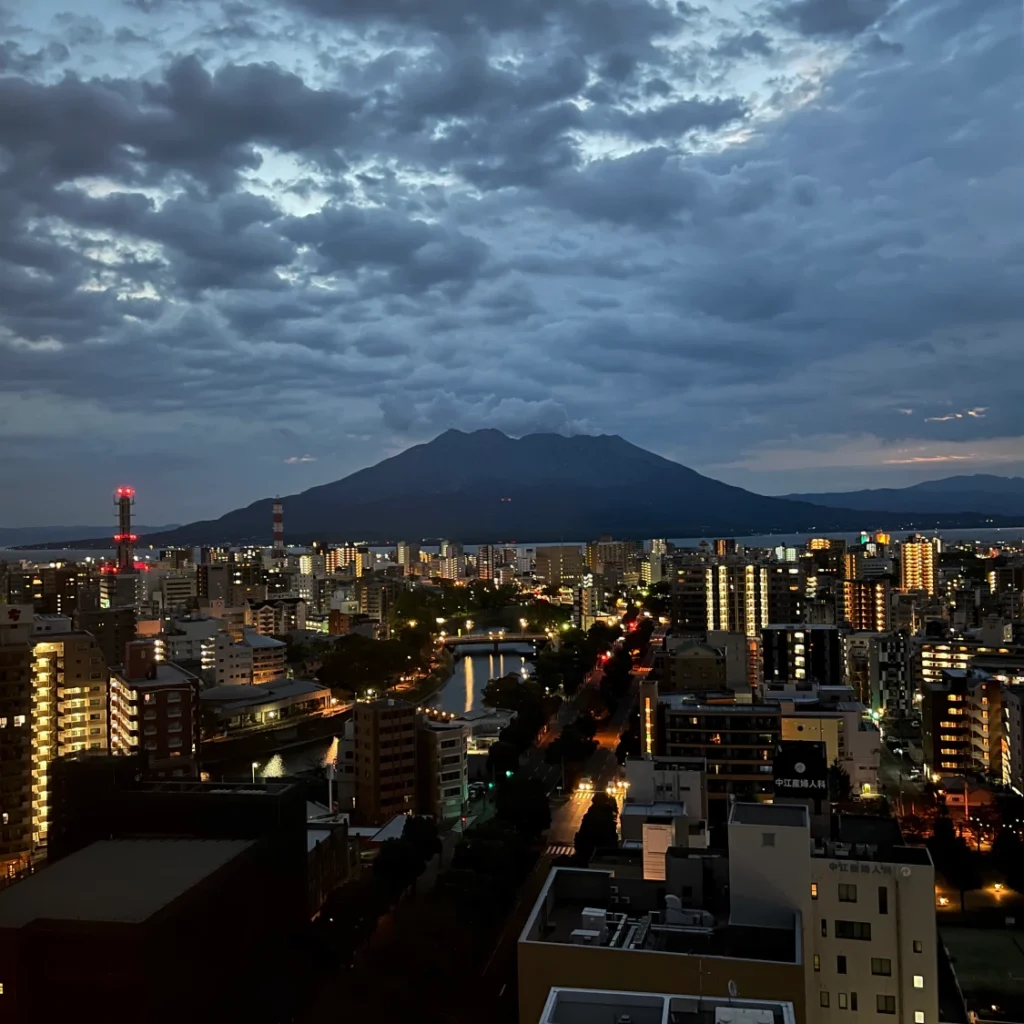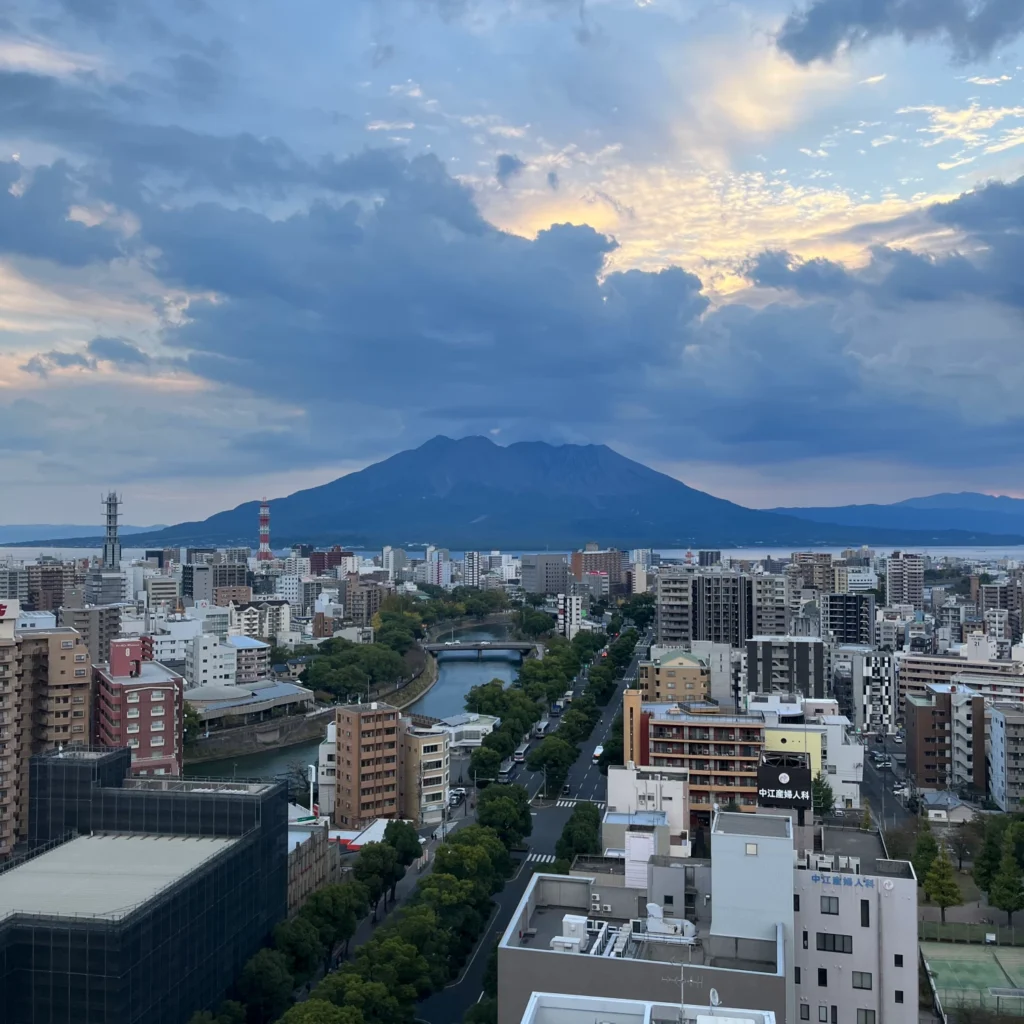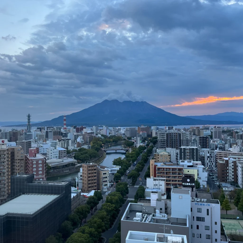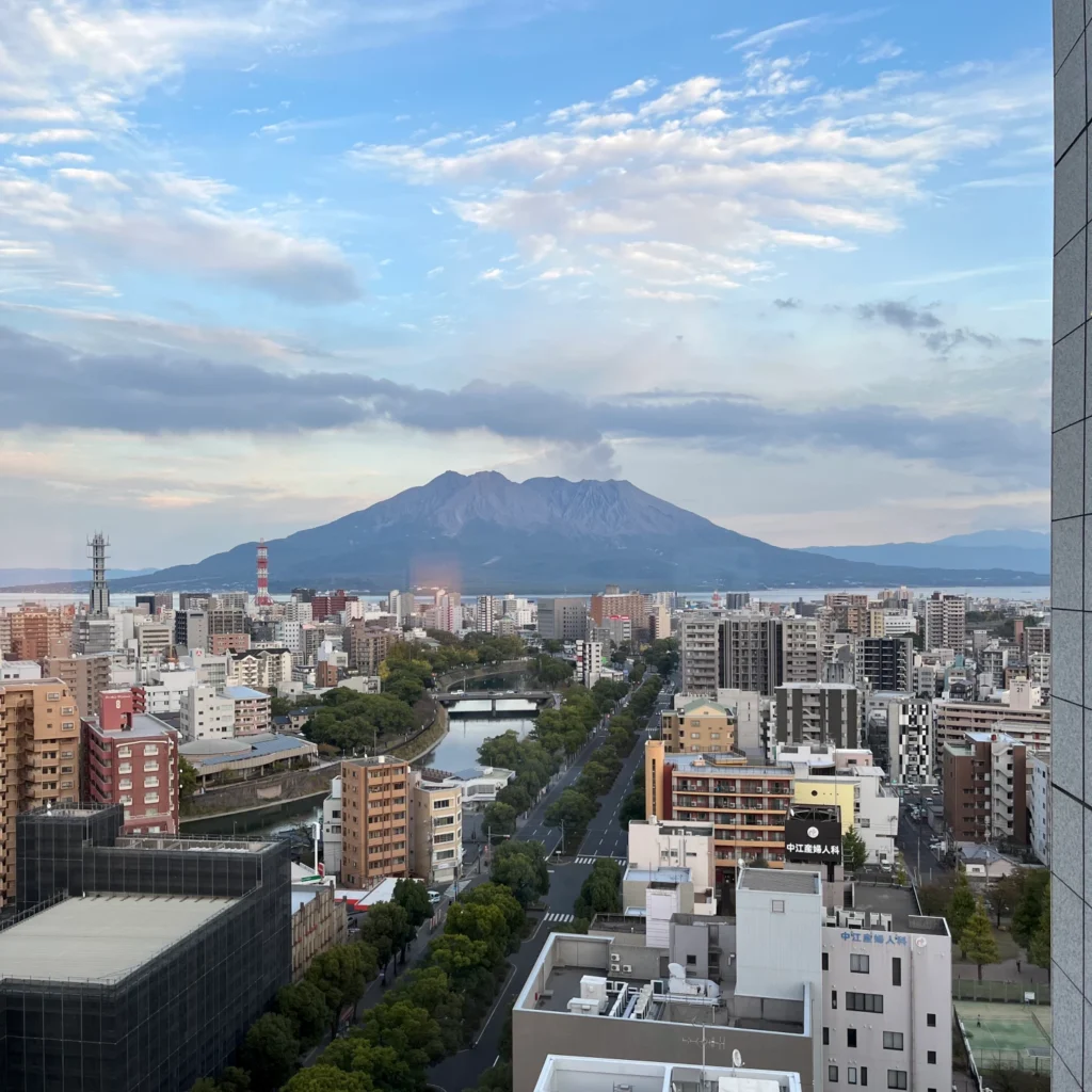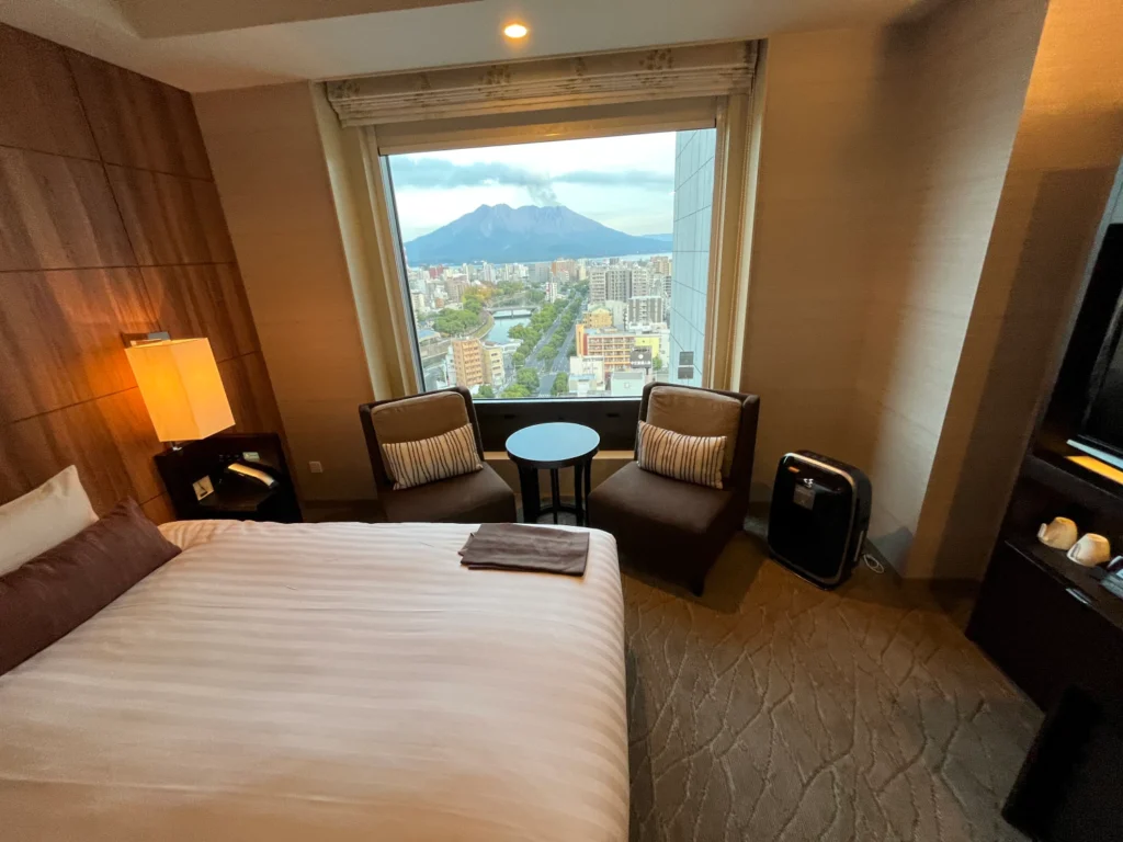 이 호텔의 특징이라고 하면 객실의 뷰가 2가지인데, 한쪽은 가고시마추오역 쪽이 보이는 뷰, 다른 한 쪽은 사쿠라지마 전망 뷰에요.