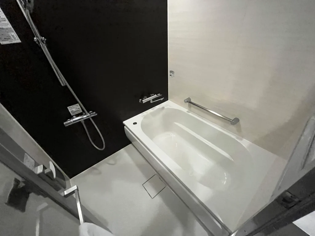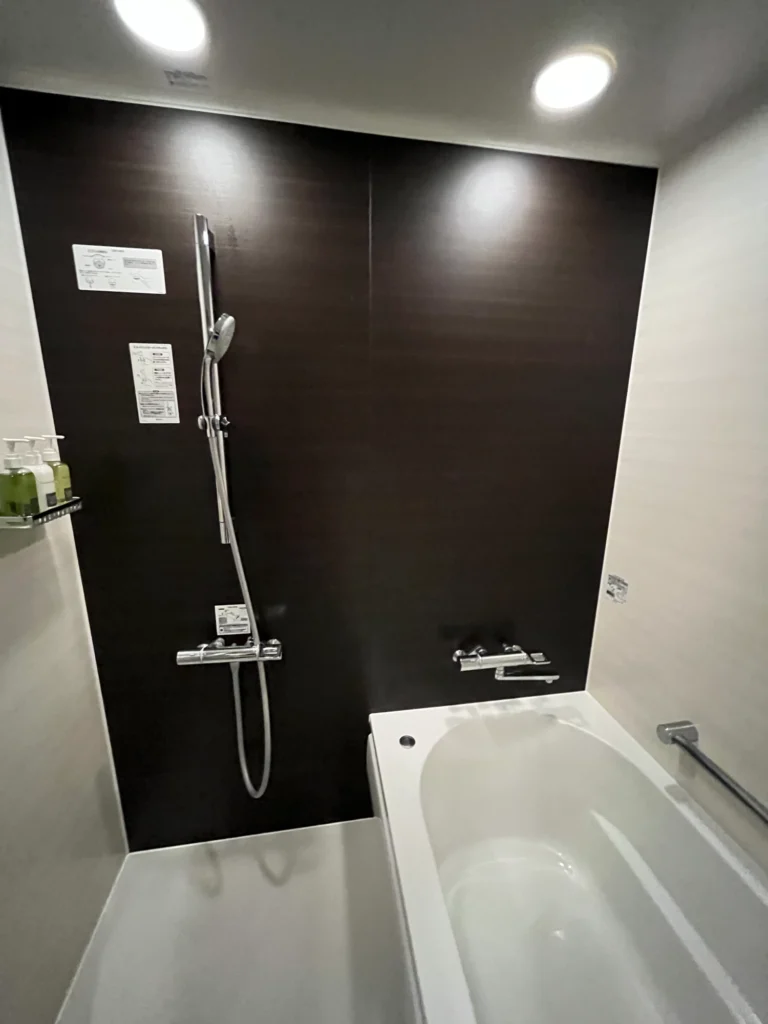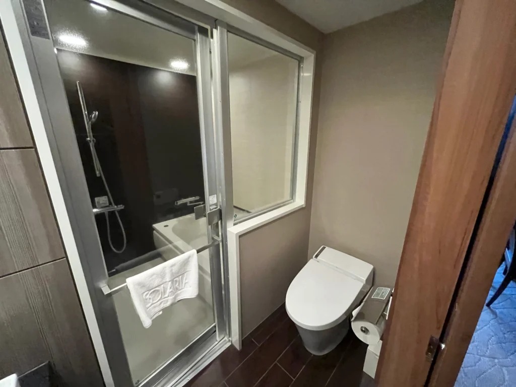 화장실은 완전 분리형은 아니지만 문을 가운데에 두고 세면대+변기, 샤워기+욕조로 분리된 형식이에요.