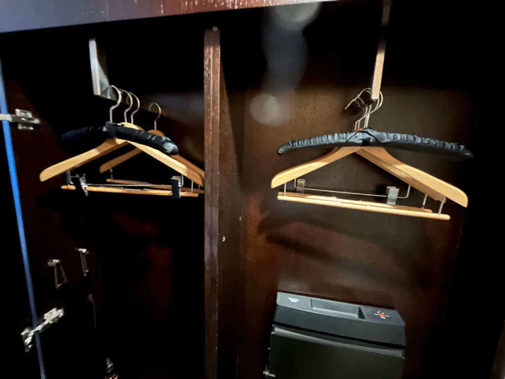 옷장은 오픈형과 문이 있는 형태가 같이 있는데, 각각 옷 3~4벌 정도 걸 수 있어요.