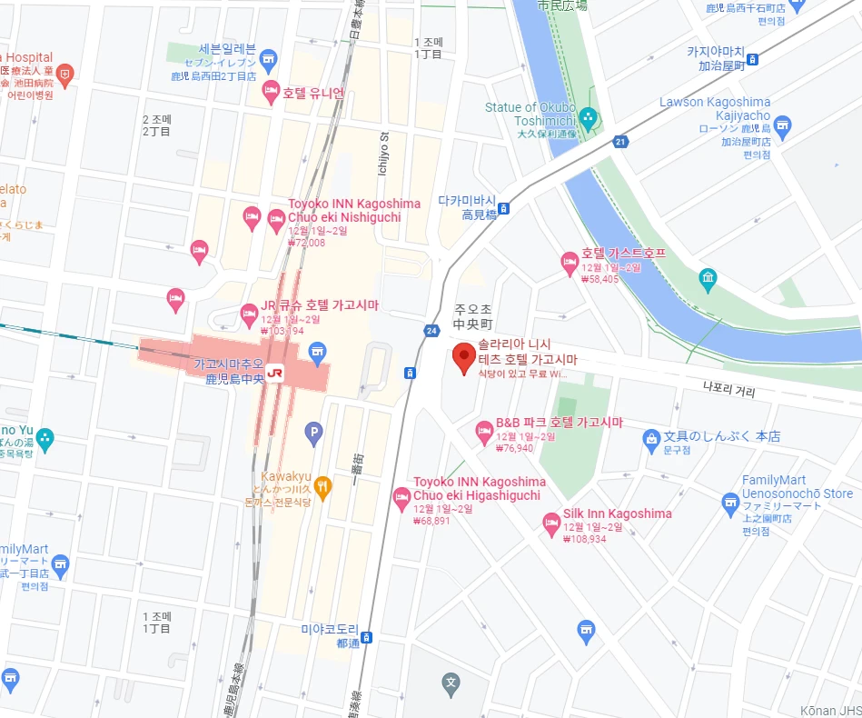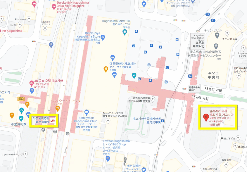 구글 지도에서 보면 솔라리아 니시테츠 호텔 가고시마는 가고시마추오역에서 정말 가까워요.