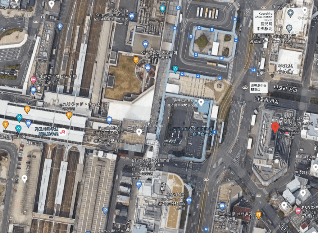 위의 지도 사진부터 보면 가고시마추오역과 호텔 사이에 있는 붉은 부분이 지하로 통하는 곳인데, 아래의 위성 지도 사진을 보면 역과 호텔 사이에는 횡단보도가 직접적으로 연결되어 있지 않다는 것을 알 수 있어요..