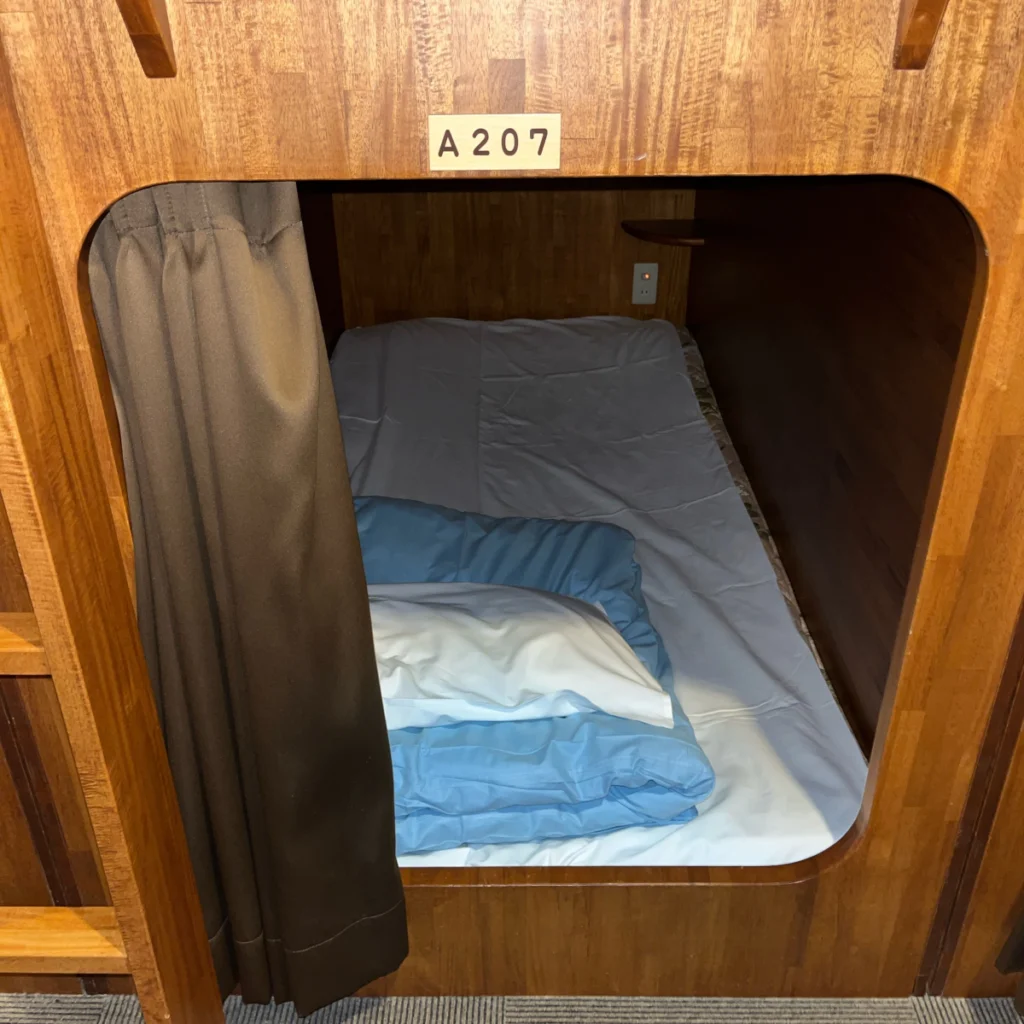 캡슐 자체는 간이 숙소 느낌이지만 목욕탕이 천연 온천이라 그런지 물이 좋았어서 그 점이 마음에 들었어요.