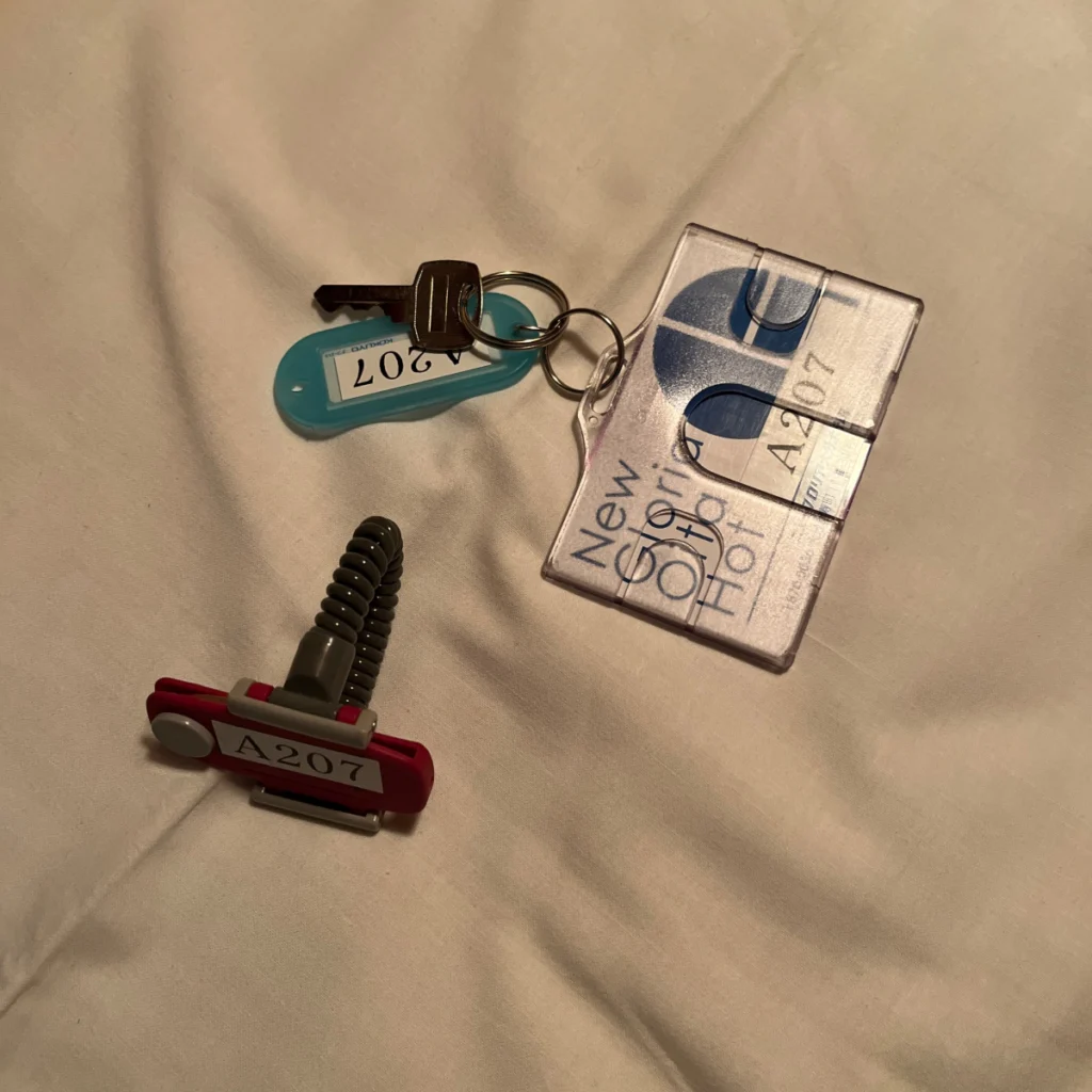 열쇠는 이렇게 주는데 왼쪽 위의 작은 열쇠가 신발장 열쇠, 왼쪽 아래의 큰 열쇠가 옷장(로커) 열쇠, 그리고 카드키가 신발장 앞의 자동문을 들어갈 수 있는 키에요!