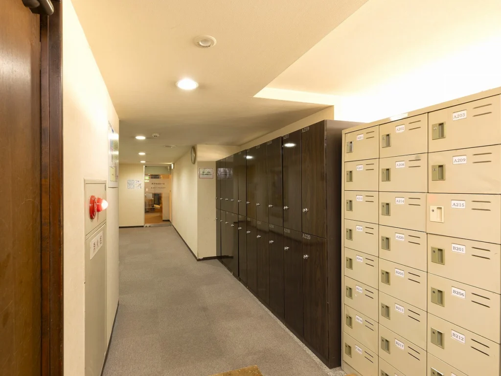 오른쪽에 보이는 작은 로커에 신발을 넣고, 왼쪽에 보이는 큰 로커에 가방이나 옷을 넣을 수 있어요.