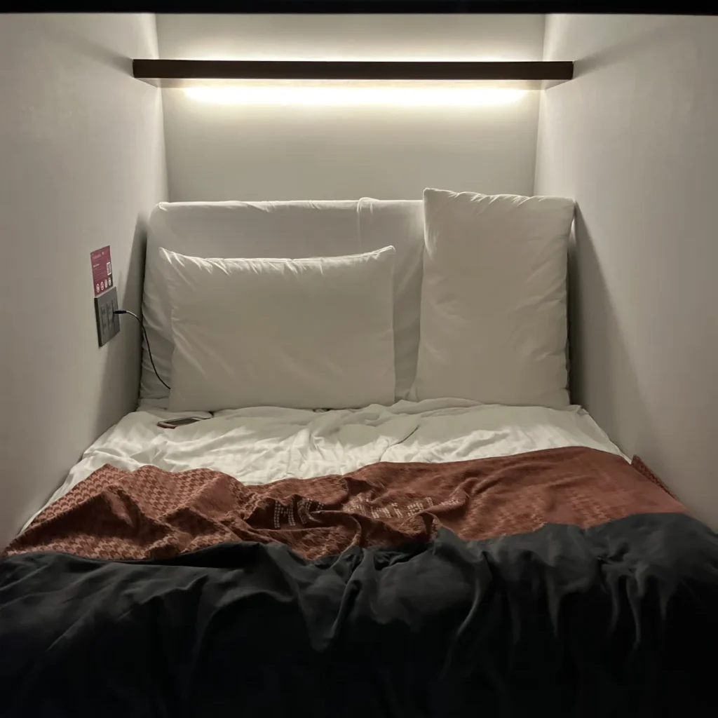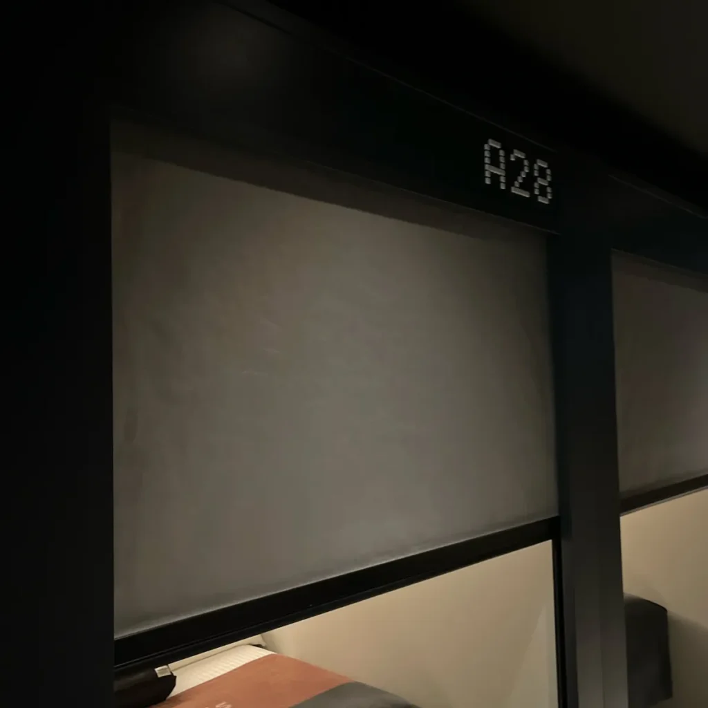캡슐 위에 보면 팬이 있고, 캡슐에 있는 폰으로 켜고 끌 수 있지만 중앙냉난방이기에 온도조절 등이 불가능해서 간절기인 3월 말에 묵었던 경험으론 꽤 더웠어요…